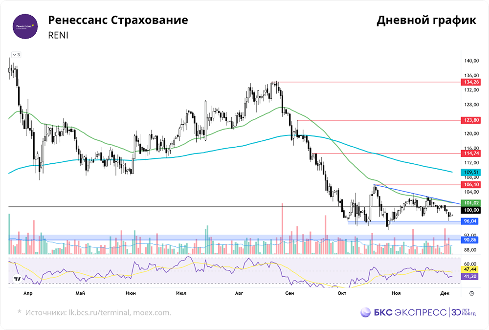 Мнение: БКС Экспресс Анализ акций Ренессанс Страхования Акции «Ренессанс Страхования» в четверг выросли на 0,45%, достигнув 97,74 руб. Торги прошли со средним объемом — 89 млн руб. Утром в пятницу бумаги прибавили 0,1% к уровню четверга. Краткосрочная перспектива • После просадки в среду акции компании медленно восстанавливались. Бумаги индекса МосБиржи закрылись в основном в плюсе. Индекс вырос на 0,2% в ходе основной сессии и еще на 0,14% вечером. • Котировки не смогли закрепиться выше 100 руб. и откатились к поддержке 95–96 руб. В среду акции достигли технической границы, но не продолжили падать. Вчерашняя попытка роста встретила сопротивление продавцов. • Новостной фон остается нейтральным. Данные по инфляции благоприятствуют смягчению денежно-кредитной политики. Внешний фон стабилен, с ожиданием улучшения в будущем. На следующей неделе решат вопрос о выплате дивидендов за третий квартал 2025 года. • Ноябрьская динамика была слабой, и акции не смогли сформировать коридор 96–106 руб. Вместо этого сформировался сужающийся треугольник с нижней границей около 96 руб. • Декабрьская динамика будет зависеть от двух ключевых событий: решения акционеров о дивидендах и решения Банка России по ключевой ставке. Если оба фактора сложатся благоприятно, акции могут пробить нисходящий тренд и приблизиться к 200-дневной средней. В противном случае они продолжат тестировать поддержку 95–96 руб., с риском снижения до 91 руб. • Высокие объемы торгов на фоне снижения котировок могут указывать на усиление давления продавцов. Обычно во время роста объемы ниже, чем при падении. • Индекс относительной силы находится в нейтральной зоне. Котировки на дневном графике торгуются ниже 200-дневной EMA. Внешний фон В четверг индекс S&P 500 прибавил 0,11%. Утром фьючерс на S&P 500 вырос на 0,2%. Азиатские индексы показывают разнонаправленную динамику. На мировых рынках нефть Brent падает на 0,1%, до $63,1 за баррель. Уровни сопротивления: 106, 110, 115. Уровни поддержки: 96, 91, 85. Долгосрочная перспектива • В октябре 2021 года акции «Ренессанс Страхования» вышли на IPO по 120 руб. В тот же день был достигнут исторический максимум около 150 руб. • Осенью 2025 года акции резко упали на 22% за две недели, пробив восходящий канал. Падение остановилось у 200-дневной скользящей средней после отскока от 107,4 руб. • В августе 2025 года бумаги достигли локального максимума 135 руб., после чего начался нисходящий тренд. Котировки пробивали трехлетний восходящий тренд и 200-дневную среднюю. Снижение продолжалось до уровня 100 руб., после чего приостановилось. • Ноябрьский рост был слабым, а длинная верхняя тень свечи не дает оснований для оптимизма. Сужающийся треугольник вызывает беспокойство, так как высока вероятность продолжения нисходящего движения в среднесрочной перспективе. Автор: Смирнов Андрей Не является индивидуальной инвестиционной рекомендацией Пост взят с соцсети [M O N D I A R A](https://i.mondiara.com/) 👉 вот ссылка на канал: https://i.mondiara.com/i/c/renessans_analytics Скачать в [App Store](https://apps.apple.com/ru/app/m-o-n-d-i-a-r-a/id6475953453) Скачать в [Google Play](https://play.google.com/store/apps/details?id=com.mondiara.app) Валюта расчёта - Ваши добрые мысли! Спасибо, что с нами! Источник: bcs-express.ru