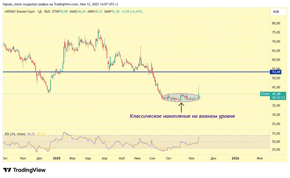 Что дальше? Зависит от уровня инсайда, при неплохих обстоятельствах может дойти до сопротивления в районе 53. Но, судя по октябрьскому пампу, высок риск снова уйти к поддержке и встать в очередное накопление.