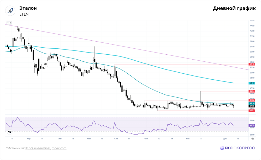 Мнение: БКС Экспресс Боковик в акциях Эталона Во вторник акции «Эталона» снизились на 0,86% до 39,09 руб. Объем торгов был низким — всего 0,11 млрд руб. Утром в среду бумаги немного выросли, прибавив 0,2%. Краткосрочная перспектива • Вчера акции «Эталона» немного снизились на фоне низкой торговой активности. Большинство российских бумаг завершили день в плюсе. Индекс МосБиржи потерял 0,09% по итогам основной сессии, но вырос на 1,23% после вечерней. • В первой половине вторника акции «Эталона» не показывали явной динамики, колеблясь в узком диапазоне. Позже они резко упали на 3,5% за час, но затем отыграли значительную часть потерь. • За день сформировалась свеча с небольшим черным телом и заметными тенями сверху и снизу. Это нейтральный сигнал. • С конца сентября акции движутся в диапазоне 36,82–41,86 руб. Пока нет сигналов к выходу из этого коридора. Свечи, приближающиеся к его границам, закрываются с заметными тенями. • Учитывая текущую техническую картину, лучше придерживаться позиционной торговли. Покупки можно рассмотреть у нижней границы диапазона, около 37 руб., с фиксацией прибыли на уровне 41,8 руб. Это позволит работать с текущей позицией и докупать акции на прибыль от краткосрочных сделок без дополнительных затрат. • В среднесрочной перспективе акции выглядят слабо. На графике нет признаков сильного интереса покупателей. Акции торгуются значительно ниже всех трендовых линий. Внешний фон • Индекс S&P 500 в понедельник потерял 0,09%, а фьючерс на него утром был нейтрален. Индексы Азиатско-Тихоокеанского региона снижаются. Фьючерс на нефть Brent на Мосбирже во вторник упал на 0,51%, на международных рынках нефть утром в минусе на 0,1% и торгуется на уровне $61,9 за баррель. Уровни сопротивления: 41,86, 46,24, 50. Уровни поддержки: 36,82, 35, 30. Долгосрочная перспектива • Глобально депозитарные расписки «Эталона» движутся вниз с конца января 2021 года, потеряв около 72%. Текущая трендовая линия проходит около 95 руб. • После обвала в феврале 2022 года поддержка была найдена ниже 40 руб., что стало началом восстановления, ограниченного восходящим каналом. • В 2024 году началась затяжная коррекция, и бумага вышла из канала. Разворот среднесрочной динамики произошел в декабре 2024 года от уровней минимумов 2022 года. • Во время падения в 2025 году акции обновили абсолютные минимумы, но не упали значительно ниже. • На недельном таймфрейме нет сигналов к выходу из боковика. Акции находятся в диапазоне накопления около абсолютных минимумов. Можно говорить лишь о стабилизации котировок после затяжной коррекции. • Аналитики БКС дают негативный прогноз по акциям «Эталона». Прогнозная цена на год — 40 руб. Автор: Решетников Олег Не является индивидуальной инвестиционной рекомендацией Пост взят с соцсети [M O N D I A R A](https://i.mondiara.com/) 👉 вот ссылка на канал: https://i.mondiara.com/i/c/etalon_analytics Скачать в [App Store](https://apps.apple.com/ru/app/m-o-n-d-i-a-r-a/id6475953453) Скачать в [Google Play](https://play.google.com/store/apps/details?id=com.mondiara.app) Валюта расчёта - Ваши добрые мысли! Спасибо, что с нами! Источник: bcs-express.ru