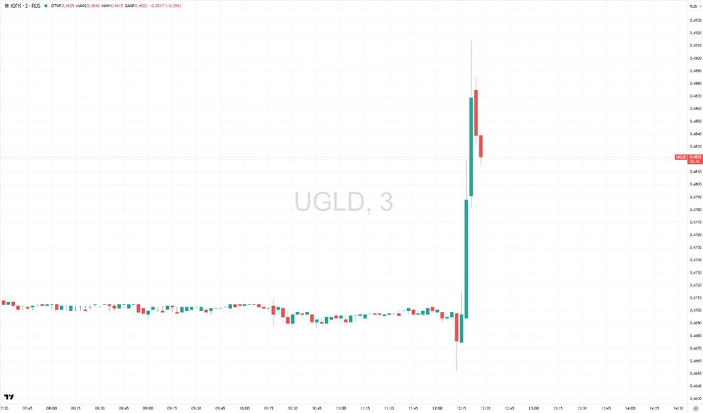 На пике стоимость бумаг «Южуралзолота» достигла 0,4914 рубля (+4,49%).
