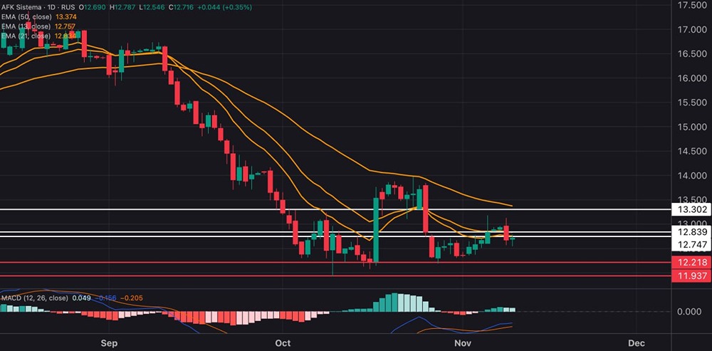 Акции АФК демонстрируют слабость к рынку, MACD второй день кряду дает сигнал на снижение, и пока котировки ниже сопротивлений ₽12,75–12,85, снижение актуально.