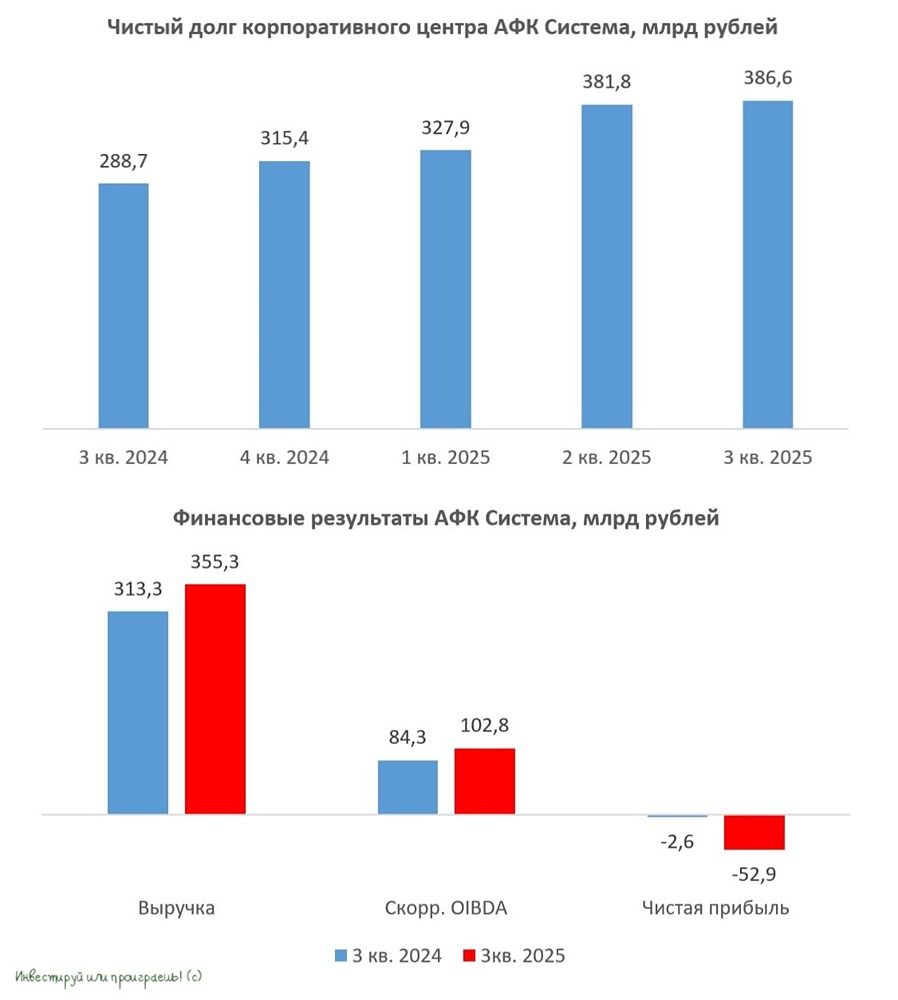 АФК Система: между оптимизацией и долговой ямой Центробанк продолжает смягчать денежно-кредитную политику, и снижение инфляции делает анализ финансовых результатов АФК Система за третий квартал 2025 года особенно интересным. Этот холдинг может выиграть от снижения процентных ставок. Выручка компании с июля по сентябрь выросла на 13,4% — до 355,3 млрд рублей. После слабого первого полугодия, когда активы показывали умеренный рост на фоне высоких ставок, холдинг вернулся к двузначным темпам. Лидеры роста — девелопер Эталон и медицинская сеть Медси. Их выручка увеличилась на 34% и 23% соответственно. Но у Эталона есть проблемы. Доля нераспроданного жилья растёт, и в октябре тенденция усилилась. Дополнительная эмиссия акций для выкупа активов у материнской компании вызывает вопросы. В начале сентября я считал эту сделку не привлекательной и сейчас не изменил мнение. Медси сохраняет лидерство на рынке коммерческой медицины и растёт быстрее рынка. Это происходит за счёт увеличения числа пациентов и роста среднего чека. Компания может выйти на IPO в ближайшие годы. АФК Система оптимизировала операционные издержки, и скорректированная OIBDA выросла на 21,9% — до 102,8 млрд рублей. Но высокие процентные расходы из-за жёсткой денежно-кредитной политики сильно давят на доходы. В итоге холдинг завершил квартал с чистым убытком в 52,9 млрд рублей. Чистый долг корпоративного центра растёт. За три месяца он увеличился на 1,3%, а за девять месяцев — на 22,7%, достигнув 386,6 млрд рублей. В структуре долга 62% — это инструменты с погашением в 2025-2026 годах, из которых около 40% нужно выплатить в следующем году. Скорость снижения ключевой ставки важна для АФК Система. В условиях высоких ставок обслуживать долг сложно. За девять месяцев процентные расходы составили 62,6 млрд рублей, что означает ежемесячные выплаты по 7 млрд рублей. Поэтому холдинг привлекает деньги от дочерних компаний. Дополнительная эмиссия в Эталоне принесла 14,1 млрд рублей, а дивиденды от Ozon могут добавить ещё около 10 млрд рублей. Рейтинговые агентства АКРА и Эксперт РА поставили негативные прогнозы по кредитному рейтингу АФК Система. Сейчас он составляет АА-, но в следующем году может снизиться до А, что приведёт к росту премии при размещении облигаций. Пока не стоит участвовать в таких размещениях. Высокая долговая нагрузка заставляет холдинг продолжать выкачивать дивиденды из МТС. Глава АФК Система Владимир Евтушенков говорил, что приемлемая ставка для бизнеса — 14%. По мере приближения к этому уровню холдинг может рассмотреть выход дочерних компаний на IPO. Но с текущими темпами снижения ставки ждать придётся долго. Покупка акций АФК Система сейчас выглядит рискованной. Если в экономике возникнут проблемы и ЦБ замедлит смягчение денежно-кредитной политики, котировки могут упасть. Не является индивидуальной инвестиционной рекомендацией Пост взят с соцсети [M O N D I A R A](https://i.mondiara.com/) 👉 вот ссылка на канал: https://i.mondiara.com/i/c/afk_sistema_analytics Скачать в [App Store](https://apps.apple.com/ru/app/m-o-n-d-i-a-r-a/id6475953453) Скачать в [Google Play](https://play.google.com/store/apps/details?id=com.mondiara.app) Валюта расчёта - Ваши добрые мысли! Спасибо, что с нами! Источник: Инвестируй или проиграешь | Юрий Козлов
