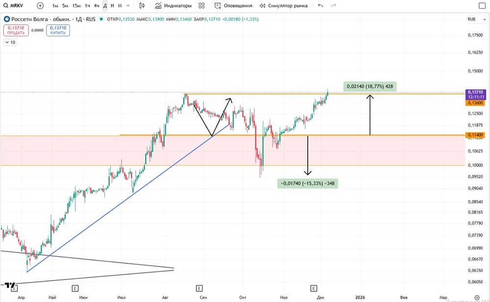 Зона поддержки, несмотря на негативные новости по энергетике, сработала. Актив отскочил и снова приблизился к своим максимумам 0,13600. Это говорит о силе покупателей, поэтому рассматривать покупку актива — правильная идея.