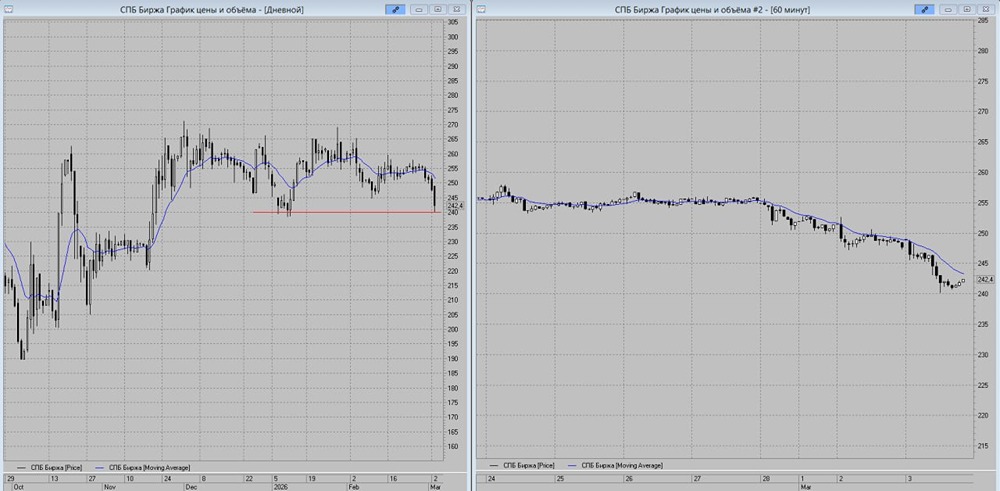Спекулятивно в моменте есть сигнал на продажу. Со стоп-лоссом чуть выше данного ориентира. Целью для фиксации прибыли выступит цена 240 руб.