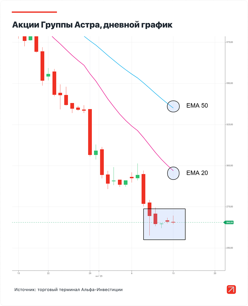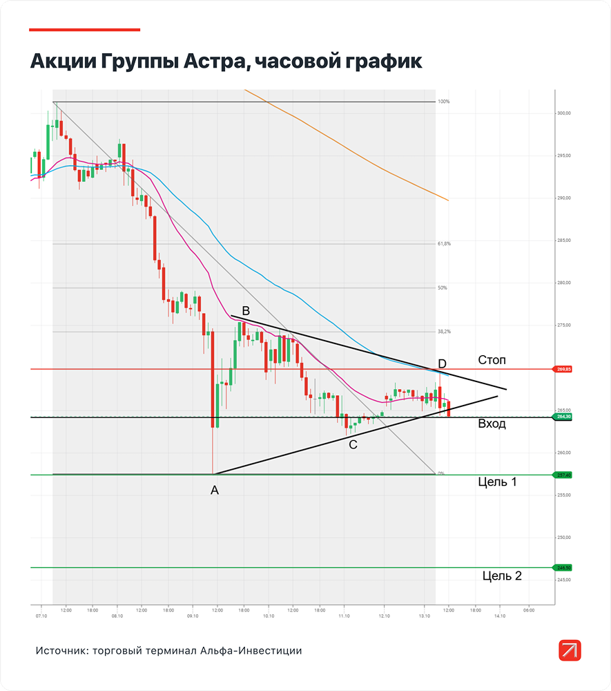 Мнение: Альфа-Инвестиции Торговый план по акциям Группы Астра • Продажа (шорт): акции Группы Астра по цене 264,15 руб. • Срок: 2-3 недели. • Цели: 257,4 и 246,5 руб. за акцию. • Потенциальная доходность: 4,6%. Суть идеи 🔸 На дневном графике формируется технический паттерн продолжения нисходящего тренда. Падение 20- и 50-дневной EMA подтверждает среднесрочный нисходящий тренд. Акция долгое время торгуется ниже этих индикаторов, что усиливает уверенность в продолжении падения. 🔸 На часовом графике формируется техническая фигура продолжения тренда — «Треугольник». После импульса от 7 октября все четыре точки построения ABCD уже сформированы. 🔸 Стандартная точка входа — закрытие трёх часовых свечей ниже 20- и 50-часовой EMA на уровне 264,15 руб. ❗️ Цель разделяем на две части: 257,4 руб. и 246,5 руб. При достижении первой закрываем 50% позиции, при достижении второй покупаем оставшуюся часть. 🔸 При достижении цели, если расстояние до следующего уровня равно размеру одного стопа, переносим стоп в безубыток с учётом комиссии. Если расстояние равно двум стопам, смещаем стоп на один стоп от точки входа в направлении цели. Повторяем, пока не достигнем всех целей. ❗️ Изначально стоп-заявку ставим на уровне 269,85 руб., ориентируясь на точку D. Если цена поднимется выше этого уровня, технический паттерн может сломаться, и идея потеряет актуальность. Автор: Роман Бахтырев Данный материал носит информационный характер и не является индивидуальной инвестиционной рекомендацией или предложением о покупке или продаже указанной ценной бумаги. Больше новостей и анализа находятся в нашем мобильном приложении [m o n d i a r a](https://i.mondiara.com/) в канале: Скачать в [App Store](https://apps.apple.com/ru/app/m-o-n-d-i-a-r-a/id6475953453) Скачать в [Google Play](https://play.google.com/store/apps/details?id=com.mondiara.app) Источник: alfabank.ru