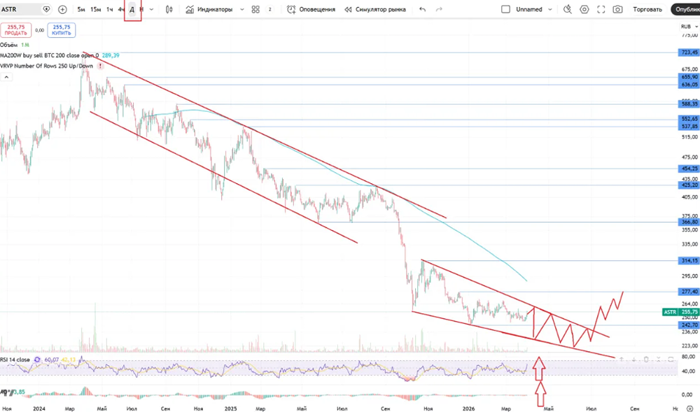 🟤 Аналитика по компании «Астра» Сектор: Программное обеспечение Последний обзор по «Астре» был 15 ноября 2025 года. Тогда акции стоили 296 ₽. Я ожидал падения до 258 ₽, а затем роста до 350 ₽. Но акции упали до 243 ₽, а потом отскочили до 267 ₽. Таким образом, в прошлом обзоре я угадал только одну цель. Сейчас акции торгуются по 255,7 ₽. Давайте посмотрим, что будет дальше. Основные метрики: - Капитализация: $656 млн - P/E: 9.02 - P/S: 2.59 - P/B: 4.72 - EPS: 27.87 ₽ - EBITDA: 8,15 млрд р. - EV/EBITDA: 6.56 По этим показателям акции оцениваются дешевле, чем в прошлом обзоре, а прибыль выросла. Давайте разберёмся подробнее. Новостной фон: - Один из крупнейших российских разработчиков софта, компания «1С», может стать акционером «Группы Астра». - «Астра» планирует привлечь инвестора, продав часть доли одного из совладельцев. Речь может идти о 20% акций. Финансовое здоровье: - Собственный капитал за 2025 год вырос на 46%, а в 2024-м — на 72%. - Чистый долг за 2025 год увеличился на 32%. - Net Debt / EBITDA: 0.25 — долговая нагрузка минимальна. Несмотря на замедление темпов роста, финансовое состояние компании остаётся отличным. Выручка и прибыль: - Выручка за 2025 год выросла на 18%, за 2024-й — на 80%. - Прибыль за 2025 год осталась на прежнем уровне, хотя в 2024-м она выросла на 66%. - Свободный денежный поток за 2025 год увеличился на 23%. Будущее и оценки: - Один прогноз от ПСБ на 19 января: цель — 435 ₽. Основные акционеры: - 59,3% — Фролов Денис - 18% — Сивцев Илья - 4,1% — ООО «Астра Инвестиции» - 0,2% — ООО «Астра Технологии» Сравнение с конкурентами: - В своём секторе компания занимает второе место по капитализации. - По основным метрикам она оценивается в среднем по рынку. - Долговая нагрузка низкая, что характерно для сектора. - Метрики рентабельности у «Астры» выше, чем у конкурентов. Дивиденды: - Компания платит небольшие дивиденды в размере 1,3–1,45%. - Дивиденды выплачиваются уже два года подряд. Технический анализ: - Я отобразил свои мысли по движению цены на графике. Выводы: - Прибыль компании за 2025 год не изменилась. - Долговая нагрузка остаётся низкой. - Метрики рентабельности высокие. - Технический анализ указывает на движение в рамках клина, после чего возможен рост. В целом, «Астра» — неплохая компания для инвесторов. Не является индивидуальной инвестиционной рекомендацией Источник: Павел Шумилов