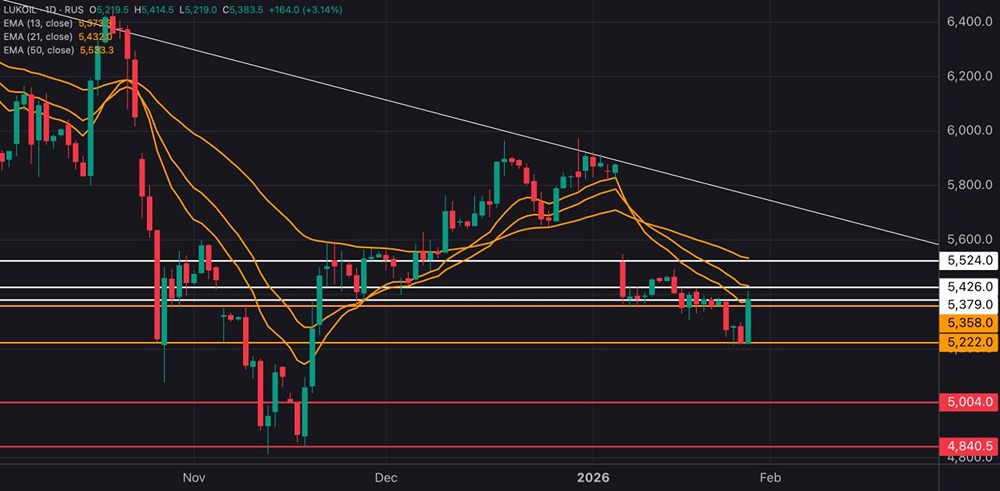 Акции ЛУКОЙЛа отработали 2/3 целей на снижение — достигли уровней ₽5360 и ₽5220. Сейчас пора освежить график и выстроить актуальный план.