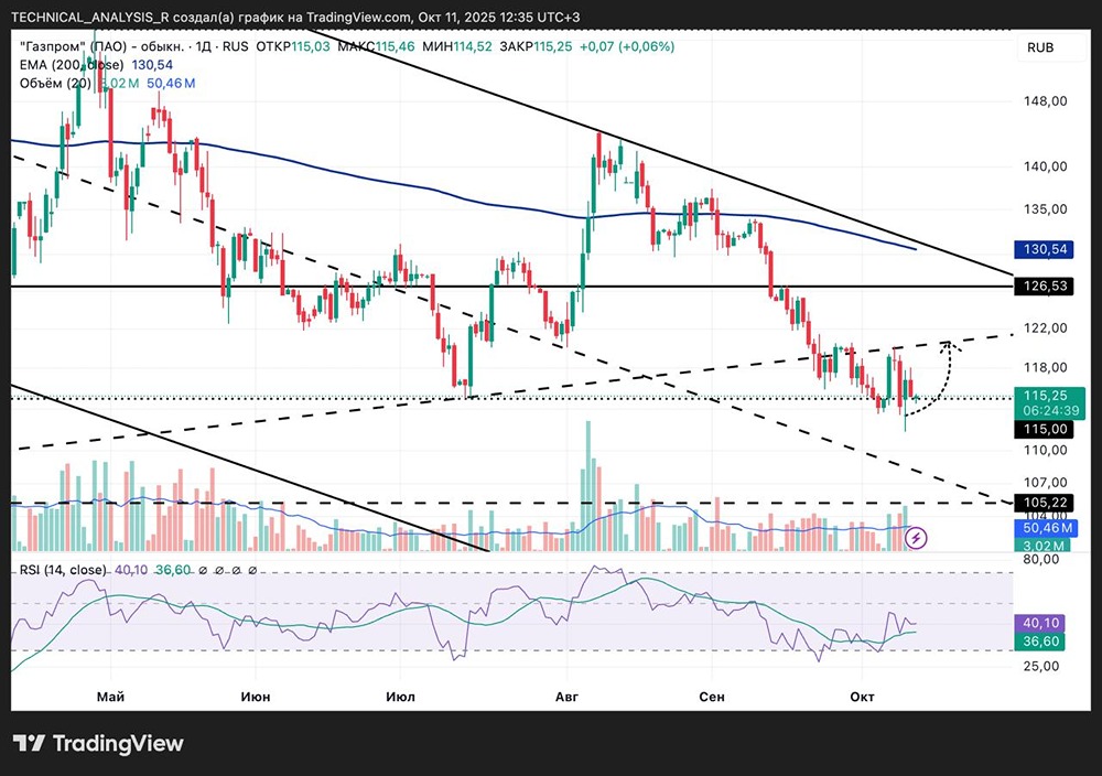 Газпром пока держится на поддержке в районе 115, от которой уже несколько раз отбивался