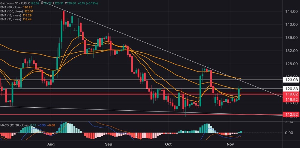 Актив отработал прогноз от 5 ноября, отскочив до ₽120 после пробоя уровня ₽118 — скромные, но приятные +1,9% прибыли сейчас у трейдера в кармане!