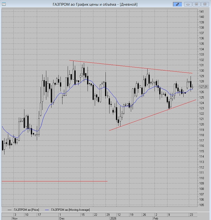 ГАЗПРОМ продолжает торговаться над линией дневной скользящей МА-13 после коррекции к данному ориентиру. Факт его удержания способствует дальнейшим откупам с перспективой роста к цене 129 руб., около которой проходит верхняя граница дневного торгового коридора.