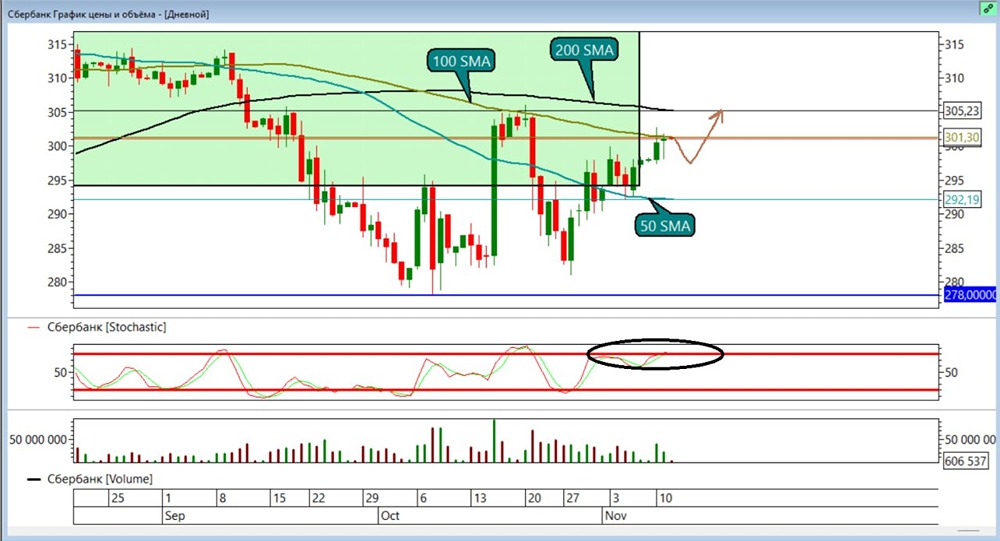 • Третья цель по лонгу на скользящей 200 SMA или ₽305,2 на сегодня.