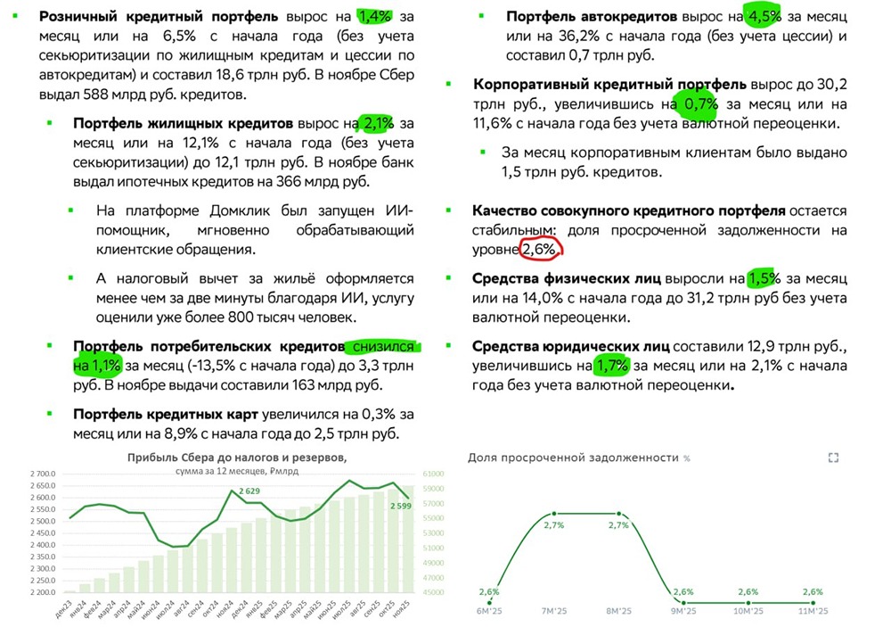 Сбер показал замедление корпоративного кредитования: что это значит для рынка Рост корпоративного кредита замедлился: • Корпоративный кредит вырос на ₽0,21 трлн, или +0,7% за месяц, и на +11,6% с начала года. Это в четыре раза меньше, чем в предыдущие два месяца, когда прирост составлял около ₽0,8 трлн в месяц. Оптимизм конца лета, видимо, иссяк. • Средства юридических лиц увеличились на ₽0,22 трлн, или 1,7% за месяц, с начала года рост составил 2,1%. Корпоративные депозиты — дорогой ресурс. • Кредит населению вырос на 1,4% за месяц и на 6,5% с начала года, то есть на ₽0,26 трлн. Основной вклад внесла ипотека (+2,1% за месяц), в основном льготная и автокредиты (+4,5% за месяц). Потребкредиты сократились (-1,1% за месяц), что влияет на потребительский спрос. • Средства населения выросли на ₽0,44 трлн, или 1,5% за месяц, и на 14% с начала года. При этом общий рост депозитов в банковской системе был скромным. Сбер активно привлекал депозиты в конце года, предлагая высокие ставки, что привело к росту ставок на рынке. Доля просроченной задолженности составила 2,6%, несмотря на увеличение портфеля. Прибыль до налогов и резервов за год не сильно изменилась, основной рост произошел за счет меньшего формирования резервов (во многом из-за валютной переоценки кредитов на фоне укрепления курса). Коэффициенты расходов и доходов (CoR) оставались стабильными около 1,5%. Сбер первым начал активно наращивать корпоративный кредит в сентябре, остальные банки последовали его примеру. Однако, вероятно, этот период скоро закончится. Сейчас это скорее краткосрочный всплеск, вызванный летним оптимизмом по ставкам. Не является индивидуальной инвестиционной рекомендацией Пост взят с соцсети [M O N D I A R A](https://i.mondiara.com/) 👉 вот ссылка на канал: https://i.mondiara.com/i/c/sberbank_analytics Скачать в [App Store](https://apps.apple.com/ru/app/m-o-n-d-i-a-r-a/id6475953453) Скачать в [Google Play](https://play.google.com/store/apps/details?id=com.mondiara.app) Валюта расчёта - Ваши добрые мысли! Спасибо, что с нами! Источник: TruEcon