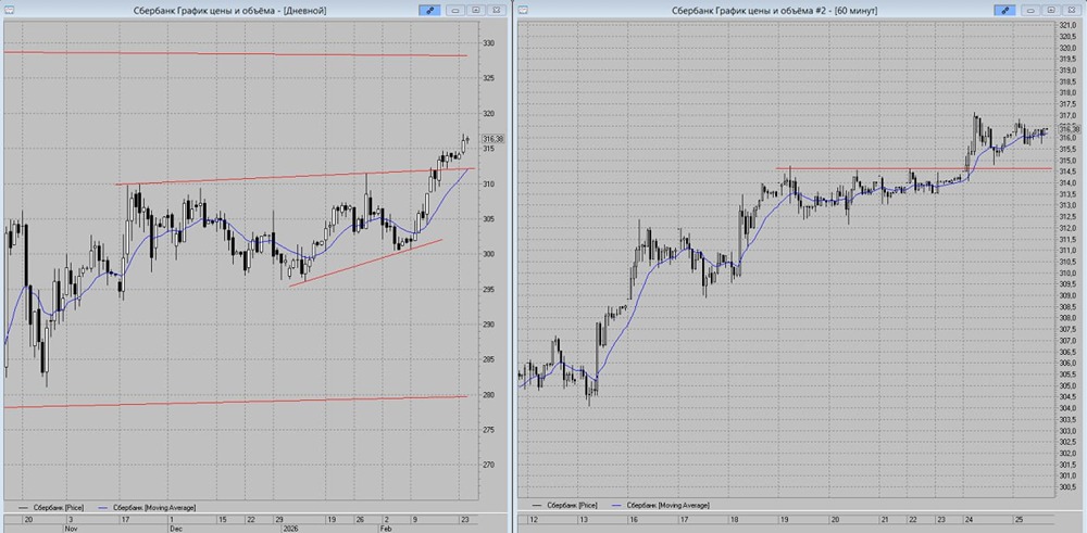 Сбербанк, несмотря на нейтральное закрытие торгов среды, относительно часового графика смог удержать линию местного уровня поддержки около цены 314,5 руб. И далее сформировать бычью конструкцию «Треугольник».