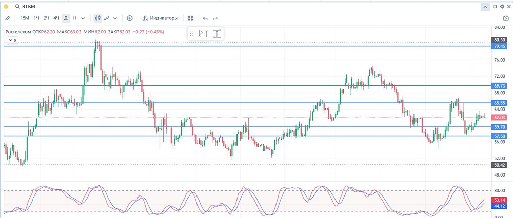 Акция: Ростелеком Тикер: RTKM ⭕ Мнение: Наблюдать ⭕ Позитивные моменты • Включение медицинской платформы Ростелекома в реестр ИТ-систем Минздрава России • Планы правительства по удвоению числа центров обработки данных к 2030 году • Ведущий игрок на российском телеком-рынке • Платит дивиденды • Компания ориентировала фокус развития на цифровых сервисах. • Рост цены на домашний интернет и платное ТВ в России • Государственная поддержка ⭕ Негативные аспекты • Потенциальный запрет международных входящих звонков на стационарные телефоны в России • Текущий уровень задолженности увеличился за 5 лет. • Ограниченный международный рост • Конкуренция с МТС, Мегафоном, Билайном • Ограничения на доступ к западным технологиям, сложности с поставками оборудования (особенно для 5G), зависимость от импортозамещения. ⭕ Дополнительно стоит учитывать • Чистая прибыль «Ростелекома» по РСБУ за 9 месяцев 2025 года составила ₽13,5 млрд, что на 30,1% ниже по сравнению с ₽19,3 млрд в предыдущем году. • Выручка увеличилась на 13,5% до ₽355,03 млрд против ₽312,72 млрд годом ранее. • Чистая прибыль «Ростелекома» по МСФО за 6 месяцев 2025 года составила ₽12,8 млрд, снизившись в 2 раза по сравнению с ₽26,1 млрд в предыдущем году. Выручка выросла на 11,5% до ₽393,6 млрд против ₽353,1 млрд годом ранее. ⭕ Дивиденды • Дивидендная политика Ростелекома предполагает выплату дивидендов в размере не менее 50% от чистой прибыли не ниже уровня, рекомендованного Росимуществом и Правительством Российской Федерации для компаний с государственным участием. Выплаты не производятся при превышении показателя Чистый долг/OIBDA значения 3. В соответствии с уставом Ростелеком обязуется выплачивать дивиденды по привилегированным акциям в размере 10% чистой прибыли по РСБУ разделенной на число прив. акций, которые составляют 25% уставного капитала компании, но не менее дивидендов по обыкновенных акциям. • DSI = 0.71 ⭕ С точки зрения технического анализа • Таймфрейм 1 день: - тренд: восходящий - индикаторы: Указывают на флэт . - условия: при закрытии ниже 61.18 руб. возможен сценарий разворота ( в шорт) • Таймфрейм 4 часа: - тренд: восходящий - индикаторы: Указывают на наличие сильного восходящего тренда - условия: при закрытии ниже 62.02 руб. возможен сценарий разворота ( в шорт) ⭕ Возможные варианты развития ситуации (4Н) • Сценарий №1: . В случае закреплени выше 62.6 📍Теоретическая цель 1: Уровень 65.55 📍Теоретическая цель 2: Уровень 69.73 • Сценарий №2: При смене тренда - движение к 61.79 и вероятное закреплении ниже 100 ема 61.17 , а далее движение к: 📍Теоретическая цель 1: Уровень 59.7 📍Теоретическая цель 2: Уровень 57.5 Данный материал носит информационный характер и не является индивидуальной инвестиционной рекомендацией или предложением о покупке или продаже указанной ценной бумаги. Также я веду свой блог: 〽️ [в соцсети Mondiara](https://i.mondiara.com/i/r/Anton-Nikitin) 🟡 [на Т-Пульсе](https://www.tbank.ru/invest/social/profile/ua1cec_invest?author=profile) 🔵 [в Telegram](https://t.me/ua1cec_trading) 🟣 [на Базаре](https://finbazar.ru/profile/ua1cec_invest) Подписывайтесь на меня, ваша поддержка дороже [золота](https://i.mondiara.com/i/r/Anton-Nikitin)